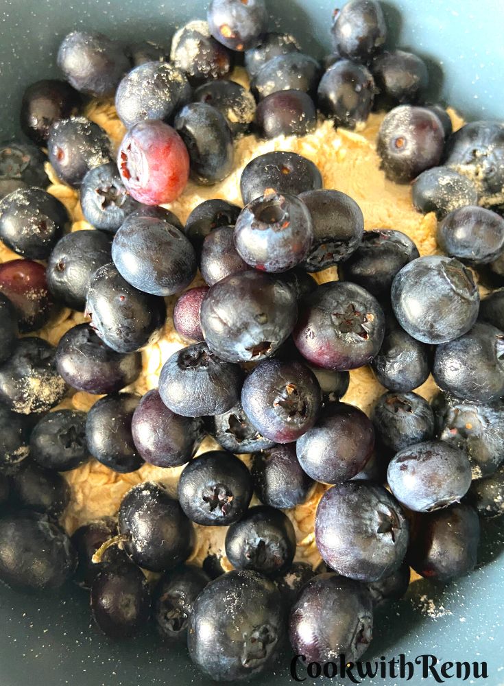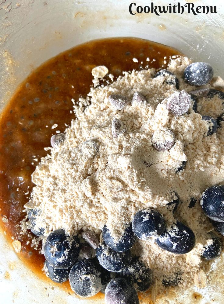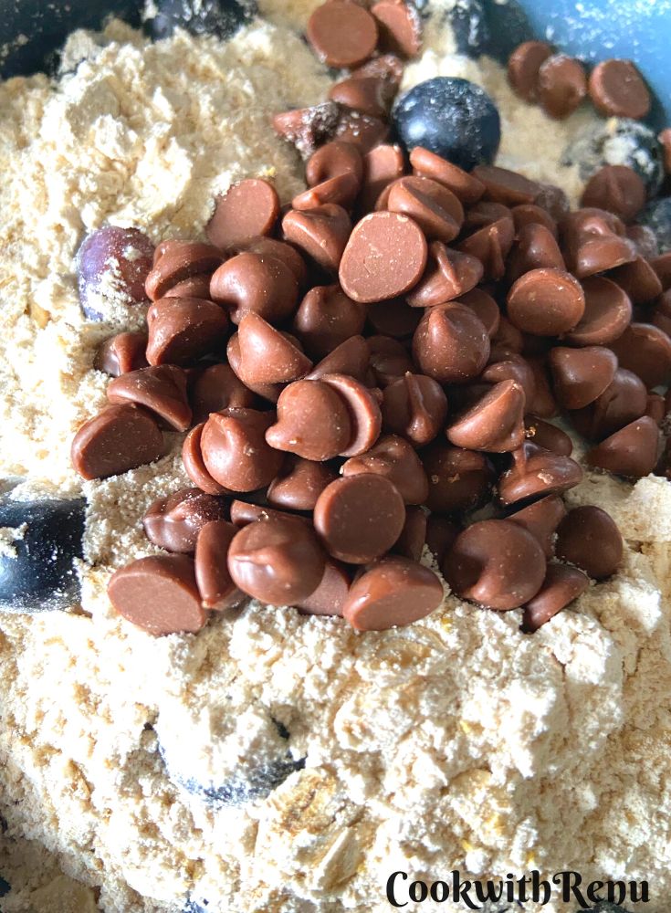 - Add chocolate chips and give it a mix so that the blueberries and chocolate are coated with flour.1 cup blueberries, ¼ cup chocolate chips + a few more to garnish