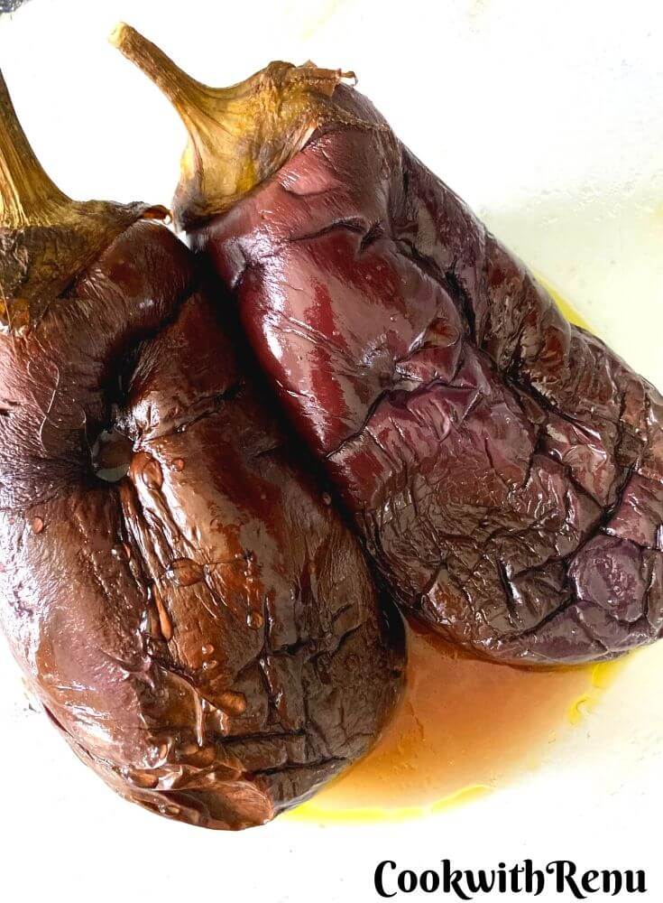 • Once it is done, the eggplant will reduce in size and when you insert a knife you should feel that it is soft from inside and done.