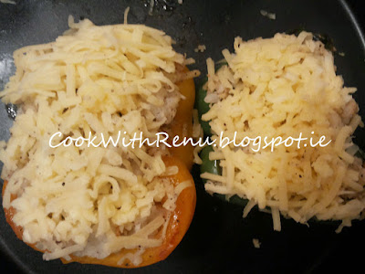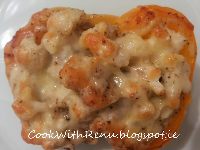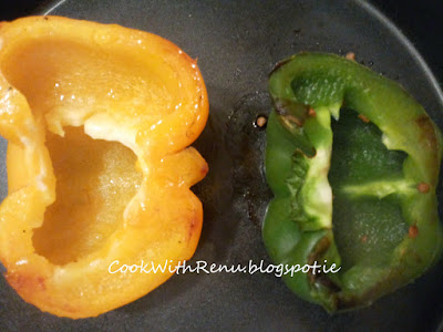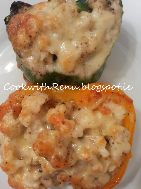 A different way of eating Peppers and Cauliflower, Loaded with proteins. We generally make peppers stuffed with potato but here the filling is of Cauliflower and cheese instead of potato. Also not a drop of oil. It is grilled. Grilling gives the peppers and cauliflower a unique taste. The cheese along with ground black pepper, give it a good flavor. Have got this recipe from the book, The Vegetarian Low-Carb Diet cook book. I have added much less cheese as the original recipe says and have used yellow and green peppers instead of just the green peppers as per the original recipe. So here goes the recipe: