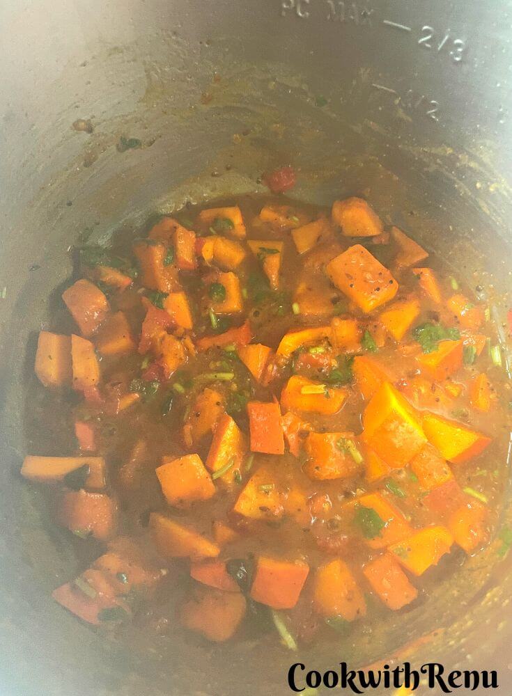 • Now add the chopped pumpkin and cook again for 2-3 minutes until the masala is well coated.