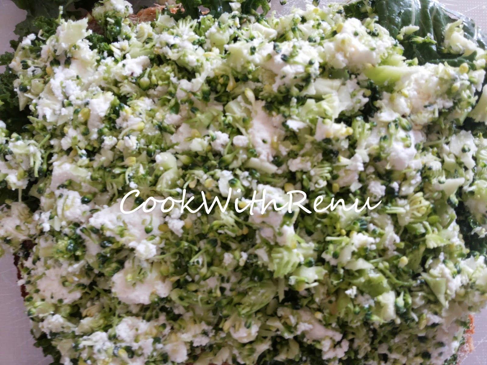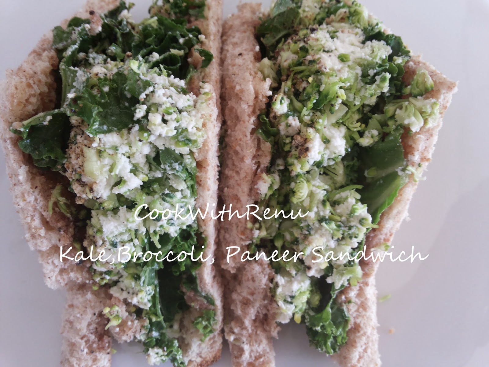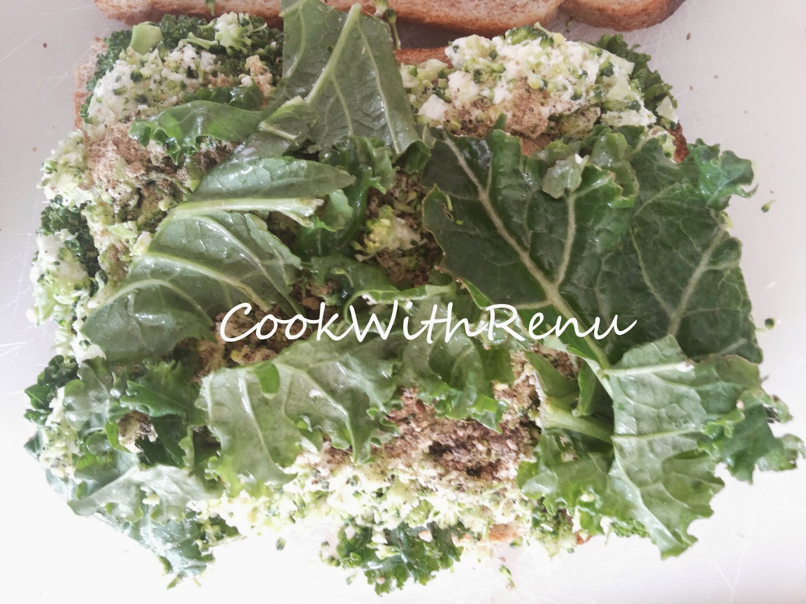 Was alone to eat and was bored of cooking something for me. Had bread at hand but bored of bread or the same old type of sandwiches so decided to experiment with this. I had Kale (Which I had never tasted before), Broccoli and some paneer at home. So thought of making a sandwich. Now generally sandwiches have lettuce but I thought of adding Kale as the leaves looked a lot crunchier. Had earlier made a paratha of Broccoli and paneer, I added that as the stuffing minus the masala’s used for paratha’s. Also instead of butter, I added my homemade Almond Hazelnut butter(Recipe to be posted soon). It had the crunch of the butter and kale. Kale was crunchier but not as sweeter as lettuce. The paneer Broccoli mixture complemented Kale. So here goes the recipe: