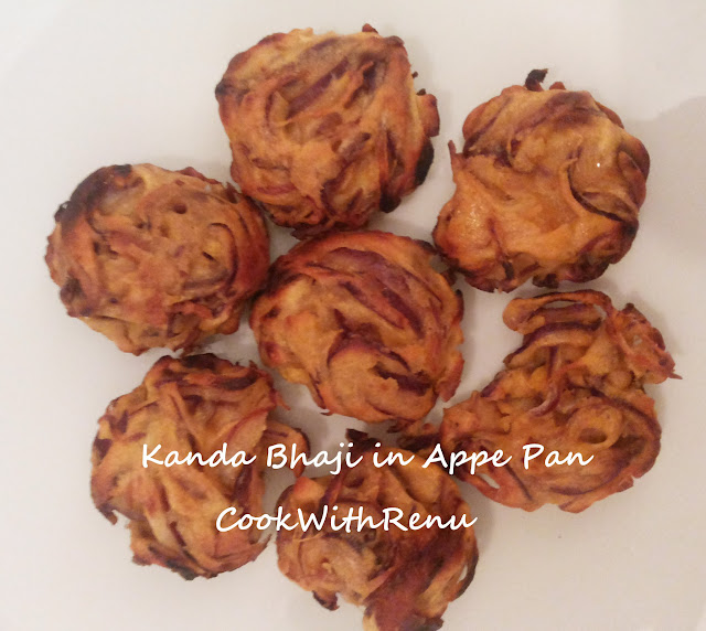So the appe pan fever did hit me too. Have lately seen many recipe’s in appe pan, and I really loved the idea. Instead of deep frying it is a good healthy option with minimal oil. Obviously the taste of deep fried snacks or food cannot be beaten but then everyone knows the hazards of eating too much deep fried. So I have given this a go and I liked it. So I first tried it with this simple and easy Onion Bhajiya/Pakoda/Fritters, Kanda Bhaji and it came out really well. It takes time and patience to cook in appe pan. I also loved the shape of it. I have below given the procedure for both Deep fried and the appe pan one.