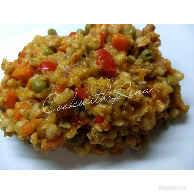 Wanted to have something spicy, hot, comforting in this cold weather, and at the same time healthy and less time consuming. Barley Soup and Khichdi were in my mind, so thought of a fusion of Barley and Khichdi. I was not sure how it will taste like as did not knew if I can actually combine both. So gave it a try. I made it a bit spicy, and made in olive oil instead of ghee and in a pot/kadai. One can even make in pressure cooker I guess, but thought Barley will go completely soggy so made it in a pot/kadai.