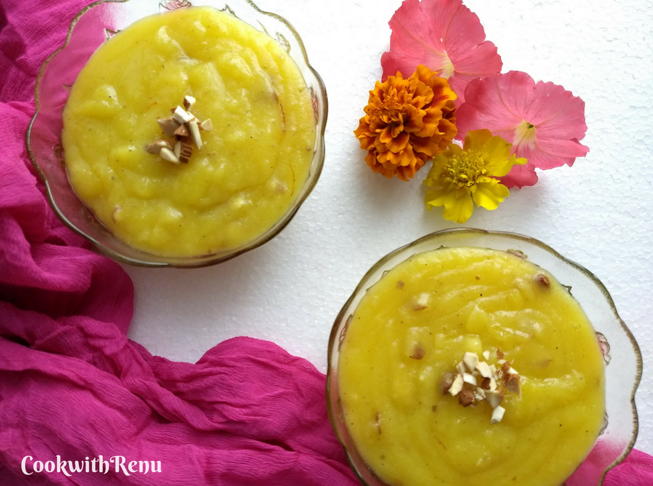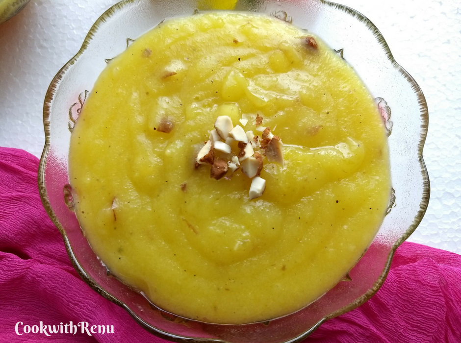 Halwa is a sweet which is typically made of grain-flour (Suji-semolina) typically, Ghee, and Sugar. There are many variations available to it. I had never made halwa with a fruit, just once before when I made pineapple halwa it did not turn out well, plus the thing that fruit in a halwa use to always deter me as was not sure how it will taste. In my last trial I must accept I really did not give it my 100 percent and the results were there. This time after seeing many post on halwa with fruits I was determined to try it with full determination.