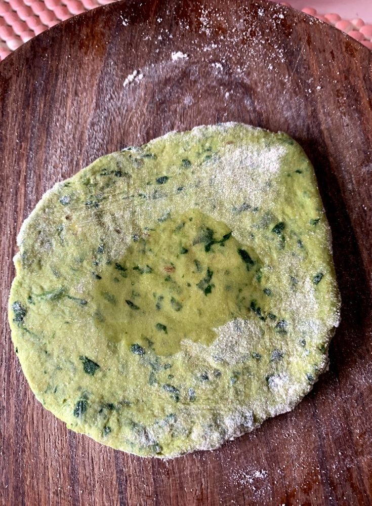 - Do not turn in between just keep on rolling the paratha. If required apply dry whole wheat flour in between to roll the parathas.