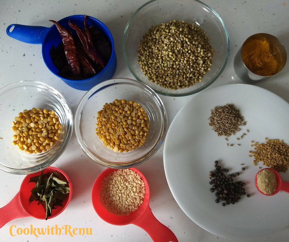 - Roast the ingredient's in the following order. 1. Dried Red Chillies2. Coriander Seeds3. Tur Dal4. Chana Dal5. Urad Dal6. Pepper Corns 7. Jeera8. Fenugreek Seeds9. Curry Leaves½ Cup Dried Red Chillies, ½ Cup Coriander Seeds (Akha Dhania), ¼ Cup Split Pigeon Peas (Tur/Arhar) Dal, ⅛ Cup Split Yellow Lentils (Chana Dal), ⅛ Cup Split White Lentils (Urad Dal), 1 teaspoon Peppercorns (Whole KaliMirch), 1 teaspoon Cumin (Jeera), 1 teaspoon Fenugreek Seeds (Methi Dana), ⅛ Cup Curry Leaves